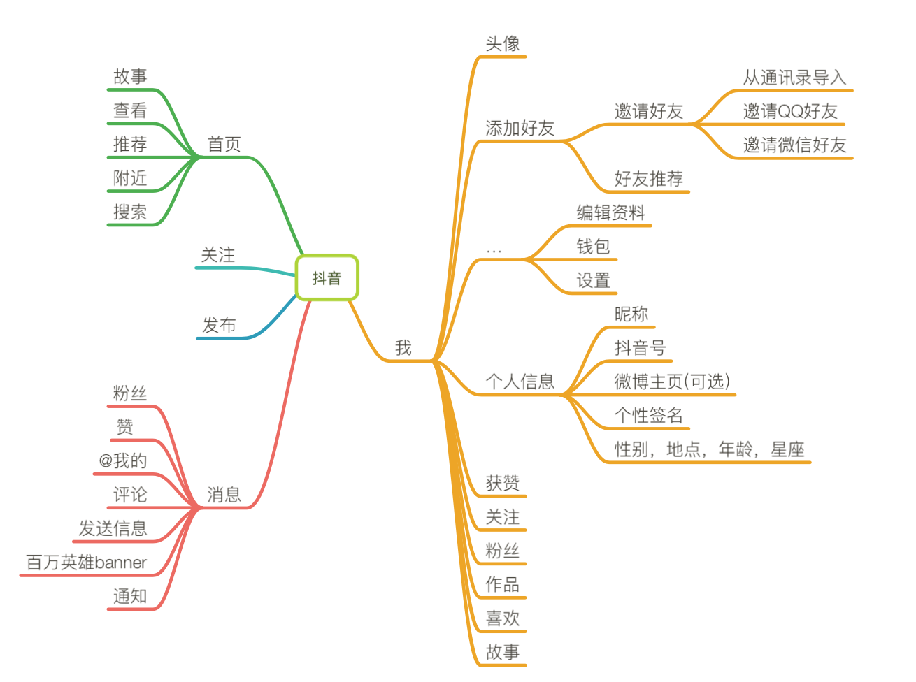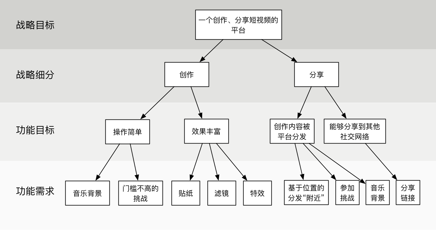 从抖音的宣传和定位上看,有如下描述:音乐创意短视频社交软件,是一个专注年轻人的15秒音乐短视频社区;让崇拜从这里开始!专注新生代的音乐短视频社区;好玩的人都在这;中国最大、最受欢迎的原创音乐短视频分享平台。抖音满足用户的核心需求是:一个创作、分享短视频的平台(可以看到随着用户规模的扩大和人群泛化,音乐属性也在削弱)。为满足这个需求,抖音提供给用户的功能分析如下: